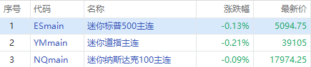 华盛资讯2月26日消息,三大期指盘前微跌,截至发稿,纳指期货 $NQmain 跌0.09%,标普500指数期货 $ESmain 跌0.13%,道指期货 $YMmain 跌0.21%。