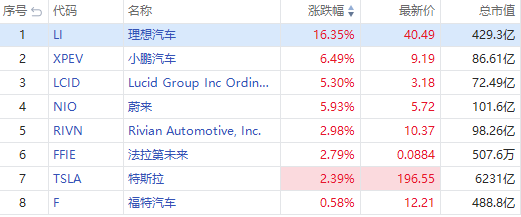 新能源汽车股集体上扬,理想汽车绩后涨超16%,小鹏汽车涨超6%,Lucid $LCID 、蔚来涨超5%,Rivian $RIVN 、法拉第未来、特斯拉涨超2%。