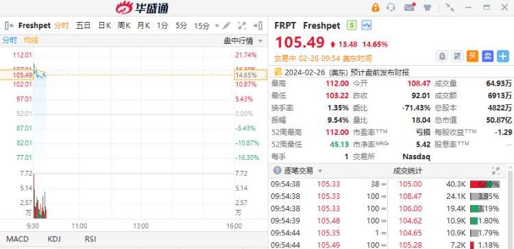 Freshpet大涨超14%,消息上,该公司第四季度营收和利润皆超过分析师预期,主要得益于广告支出增加,提振了销售额。