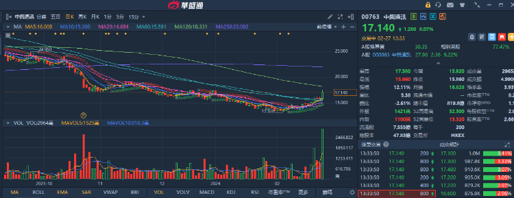 中兴通讯(00763)再涨超8%,月内累涨逾26%。消息面上,2024世界移动通信大会上,华为举办了全套5.5G产品解决方案发布会,并正式发布通信行业首个大模型,据了解,该大模型的作用包括帮助通信运营商提升运维效率等。同时华为表示,2024年是5G-A商用元年。