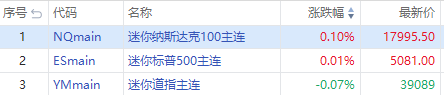 周二三大期指盘前走势分化,截至发稿,纳指期货 $NQmain 涨0.10%,标普500指数期货 $ESmain 涨0.01%,道指期货 $YMmain 跌0.07%。