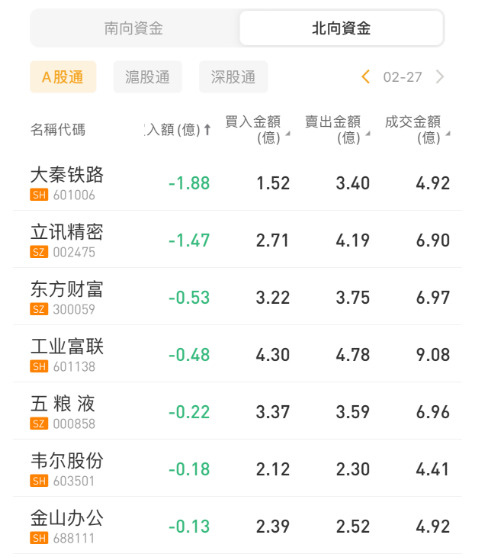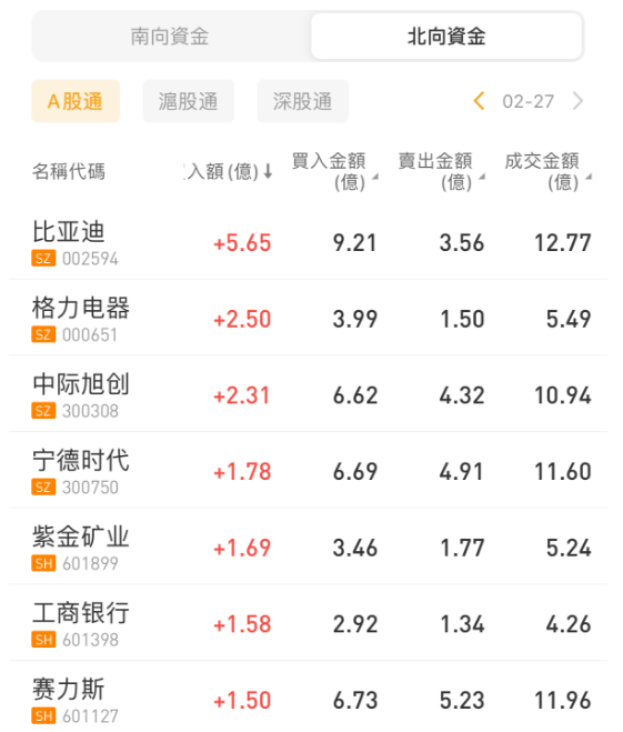 北向资金今日净买入122.48亿元。比亚迪、格力电器分别获净买入5.65亿、2.50亿元。大秦铁路净卖出额居首,金额为1.88亿元。