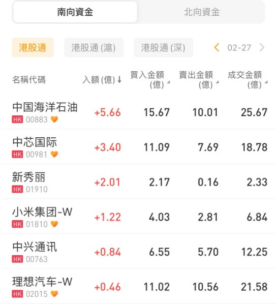其中,南向资金净买入中国海洋石油5.66亿港元,分别加仓中芯国际、新秀丽3.40亿港元、2.01亿港元;净卖出腾讯控股8.41亿港元。