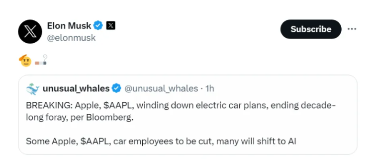 特斯拉 (TSLA.US)的CEO马斯克也对苹果这一消息表示欢迎,他在X上发布了一条带有敬礼表情的帖子。