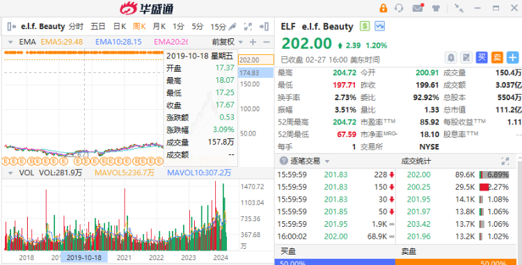 ELF于2016年9月在纽约证券交易所上市首日,股价飙升逾40%,收于每股26.50美元。如今,其股价已略低于每股200美元。这家自称“与每一只眼睛、嘴唇、脸、爪子和鳍都站在一起”的公司正以其卓越的表现征服着越来越多的投资者。尽管英伟达在人工智能领域仍具有重要地位,但ELF的崛起无疑为投资者提供了新的选择。