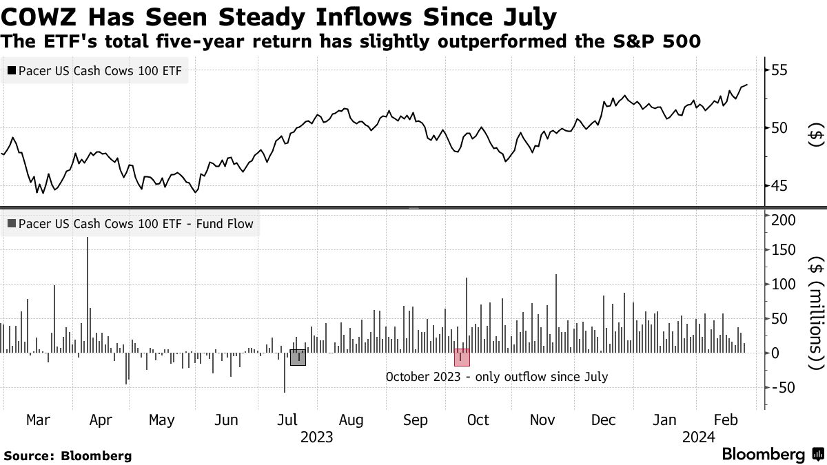 这只名为“Pacer US Cash Cows 100 ETF” (美股代码:COWZ)的ETF资产规模从一年前的125亿美元飙升至当前的200亿美元左右。机构汇编的数据显示,自2023年7月以来,这只紧密追踪高自由现金流的中盘以及大盘股的交易所交易基金(ETF)几乎不间断地吸引了巨额资金流入,在这期间仅仅有一天出现了资金净流出。