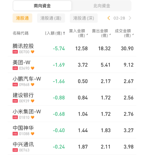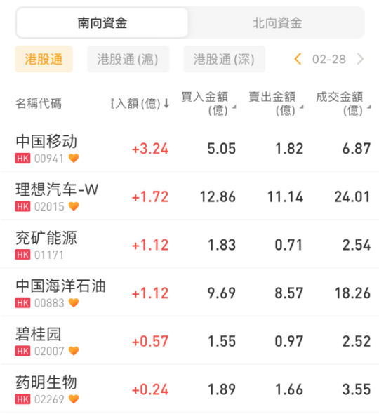其中,南向资金净买入中国移动3.24亿港元,分别加仓理想汽车-W、兖矿能源1.72亿、1.12亿港元;净卖出腾讯控股5.74亿港元。