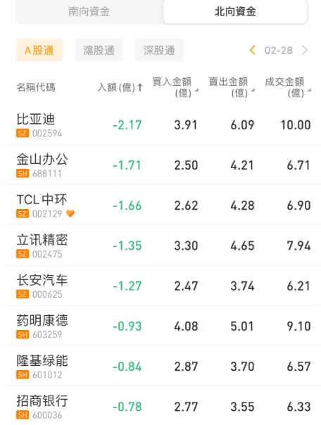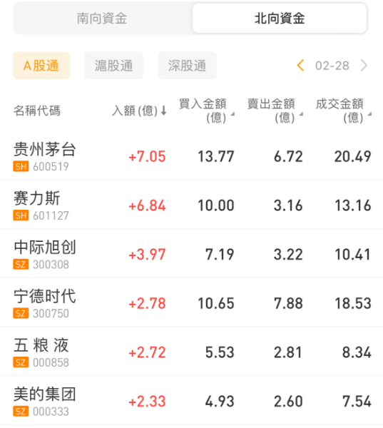 北向资金今日净买入13.40亿元。贵州茅台、赛力斯、中际旭创分别获净买入7.05亿元、6.84亿元、3.97亿元。比亚迪净卖出额居首,金额为2.17亿元。