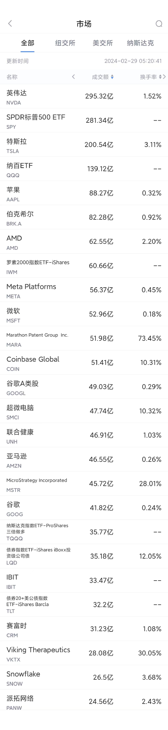 第8名Marathon Patent收高2.38%,成交51.98亿美元。周三比特币概念股普遍走高,此前比特币一度站上6万美元。比特币价格本周上涨了15%以上,今年迄今上涨了40%,主要原因可能是1月份开始交易的一系列比特币现货ETF引发的兴奋,以及即将到来的“减半”,即比特币的新增供应量将减少一半,这通常被视为比特币价格大幅上涨的催化剂。