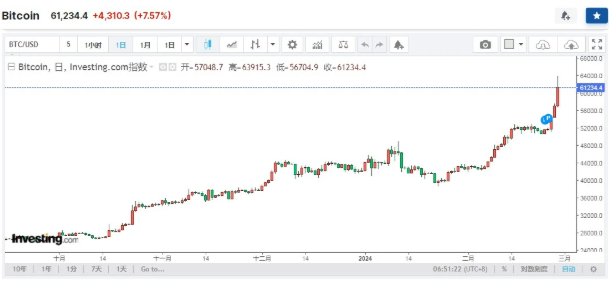 消息面上,比特币价格价格一度飙升至6.4万美元以上,触及自2021年11月以来的最高水平。今年以来,比特币价格已累计涨超40%,表现抢眼。