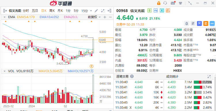 消息面上,信义光能公布,截至2023年12月31日止年度,公司收益为266.288亿港元,同比增长29.6%;公司权益持有人应占溢利为41.871亿港元,同比增长9.6%;基本每股盈利为47.04港仙,拟派每股末期股息15.0港仙。