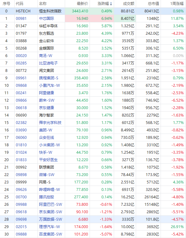 半导体概念股强势领涨,中芯国际大涨逾7%,华虹半导体涨近6%。