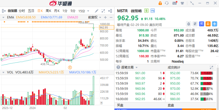 美东时间周三(2月28日),MicroStrategy的股价收涨10%,本周前三天的整体涨幅达到40%。