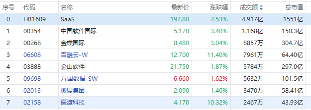 港股SAAS概念股集体走强,其中,百融云-W(6608.HK)涨超11%领涨板块,医渡科技涨超10%,中国软件国际、金蝶国际涨超3%。