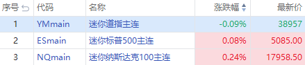 周四三大期指短线拉升,截至发稿,纳指期货 $NQmain 涨0.24%,标普500指数期货 $ESmain 涨0.08%,道指期货 $YMmain 跌0.09%。