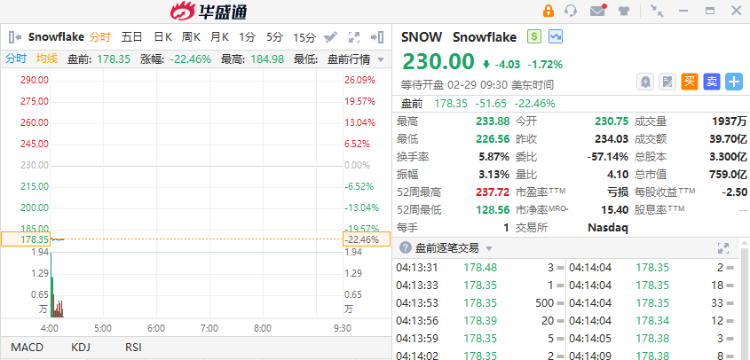 Snowflake盘前跌超22%,2025财年Q1及全年产品营收指引不及预期。