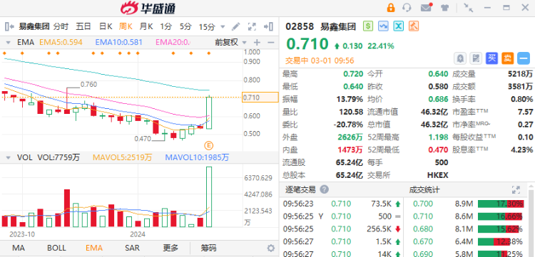 3月1日讯,港股易鑫集团(02858)绩后高开逾10%,截至发稿,涨22.41%,报0.71港元,成交额3581万港元。