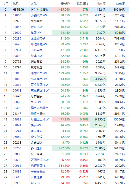 造车新势力领涨,小鹏汽车-W涨近7%,蔚来-SW涨超6%;科网股走势强劲,美团-W大涨超5%,哔哩哔哩-W、微博-SW均涨超3%。