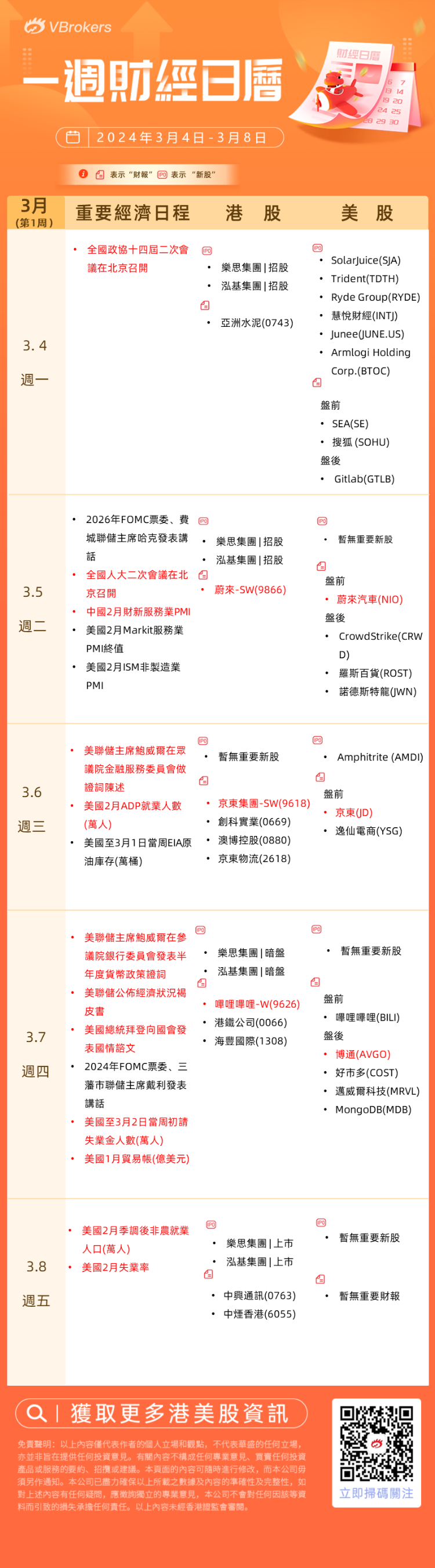 港股财报方面,可关注:蔚来-SW $09866.HK 、京东集团-SW $09618.HK 、哔哩哔哩-W $09626.HK 、京东物流 $02618.HK 、创科实业 $00669.HK 、澳博控股 $00880.HK 、港铁公司 $00066.HK 、海丰国际 $01308.HK 。