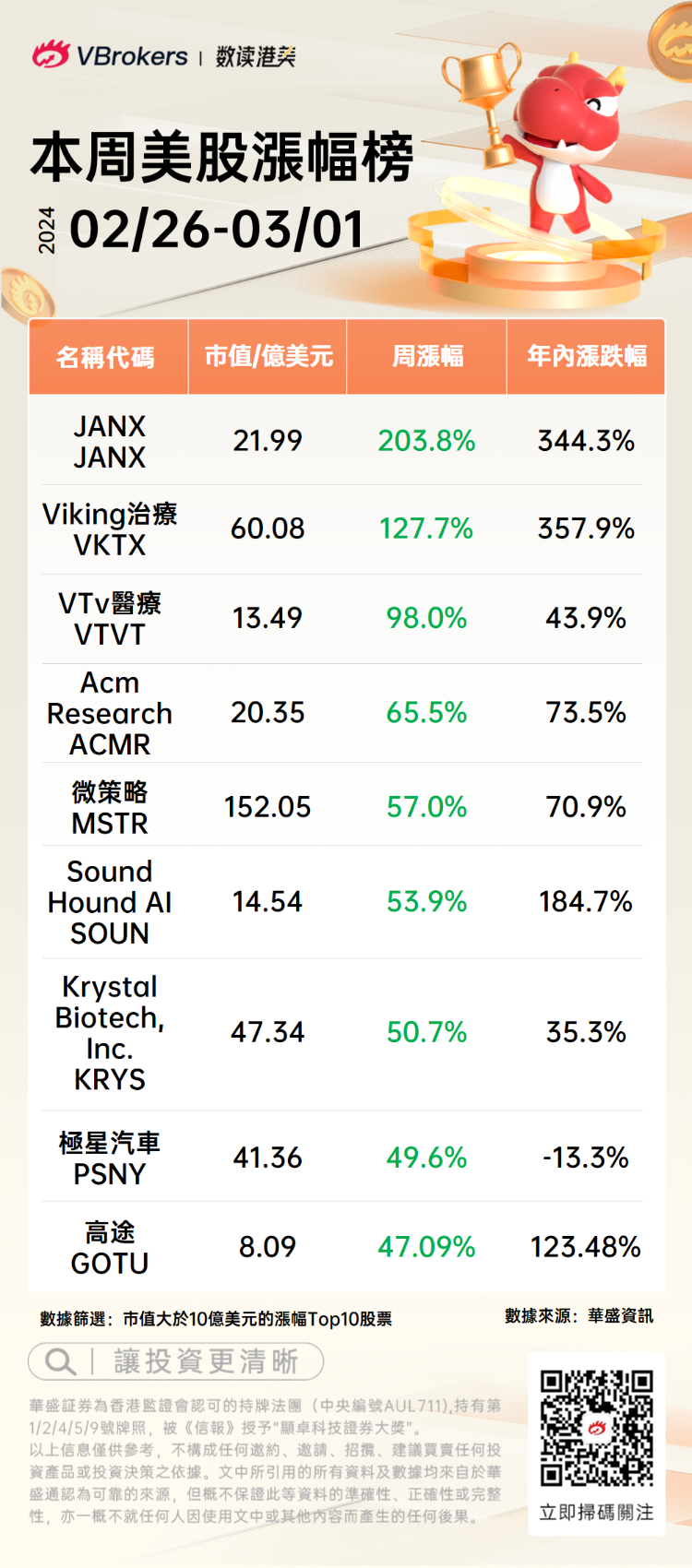 發仔梳理了每周美股涨跌幅Top10榜单,供投资者参考。