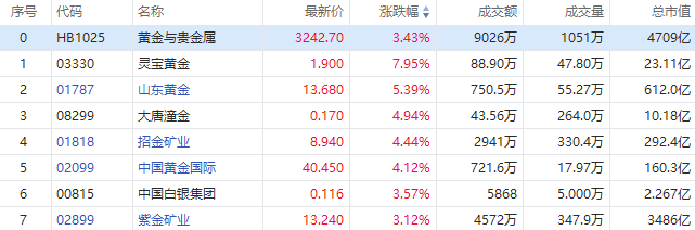 华盛资讯3月4日消息,黄金股早盘集体走强,截至发稿,灵宝黄金涨超7%,山东黄金涨超5%,招金矿业、大唐潼金、中国黄金国际涨超4%,紫金矿业涨超3%。