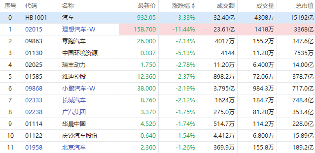 3月4日,港股汽车股早盘走低,截至发稿,理想汽车-W跌超11%,零跑汽车跌超7%,小鹏汽车-W、长城汽车跌超2%,广汽集团跌超1%。