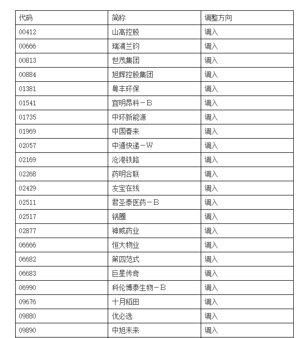山高控股、瑞浦兰钧、世茂集团、旭辉控股集团、粤丰环保、宜明昂科-B、中环新能源、中国春来、中通快递-W、沧港铁路、药明合联、友宝在线、君圣泰医药-B、锅圈、神威药业、第四范式、恒大物业、十月稻田、优必选、中旭未来、巨星传奇等股调入,调出国美零售、基石药业-B、世茂服务、中国华融、香港科技探索、和记电讯香港等股,自2024年3月4日起生效。