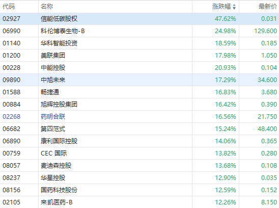 华盛资讯3月4日消息,沪深港通下港股通标的证券名单调整,部分获纳标的早盘异动拉升。截至发稿,科伦博泰生物-B涨近25%,中旭未来涨超17%,旭辉控股集团、药明合联涨超16%,第四范式涨超15%,恒大物业涨超8%。