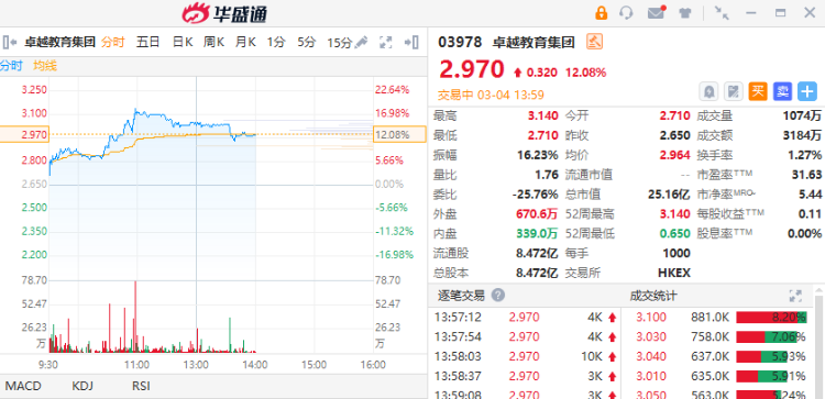 3月4日,卓越教育集团(03978)再涨超12%,股价1月24日至今累计涨幅超2倍。截至发稿,涨12.08%,报2.97港元,成交额3184万港元。