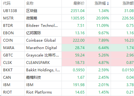 周一,部分比特币概念股走高,截至发稿,MicroStrategy $MSTR 涨超22%,Coinbase $COIN 涨超7%,Marathon Digital $MARA 涨超4%,嘉楠科技 $CAN 涨超2%。