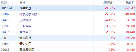 苹果概念股跌幅居前,截至发稿,舜宇光学科技(02382)跌5.39%,丘钛科技(01478)跌4.43%,比亚迪电子(00285)跌3.55%,高伟电子(01415)跌2.85%。