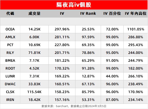 2、加密货币概念股Iris Energy( $IREN ) 隔夜股价跌超10%,期权成交量1.84万张,隐含波动率157.16%,IV百分位87%。