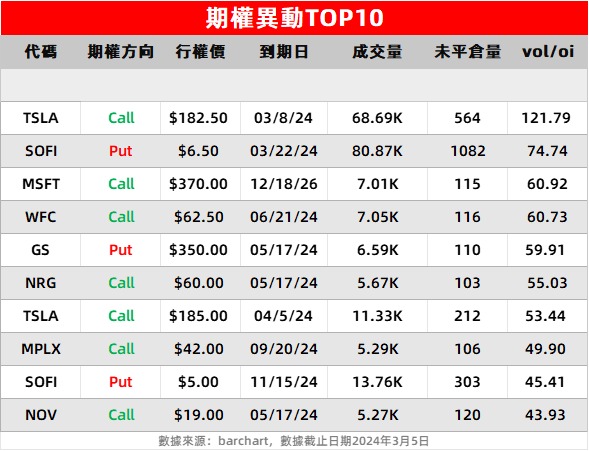 1、特斯拉隔夜跌3.93%,在连续两日大跌后,投资者开始抢筹看涨期权,多只期权大单出现异动: