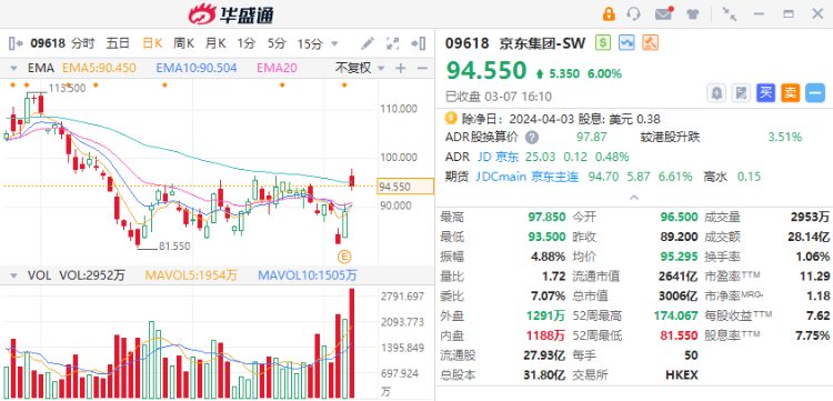 4、业绩+回购推动!京东绩后股价单日暴涨16%