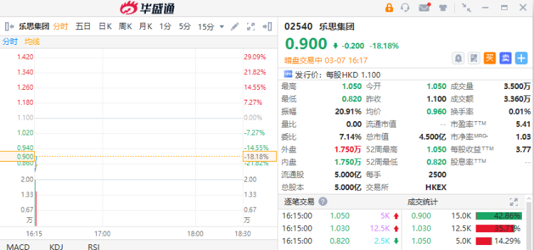 移动广告服务供应商乐思集团,截至发稿跌18.18%;该股预计将于3月8日正式挂牌上市,配售结果将于今日晚间披露。