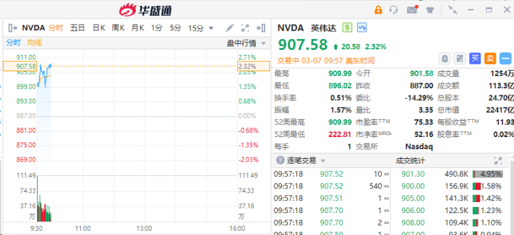 英伟达盘中涨超2%至909.92美元,再创历史新高,市值超2.26万亿美元;英伟达年内累涨83%。