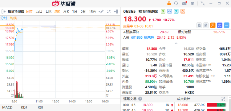 3月8日,光伏玻璃股走高,截至发稿,福莱特玻璃涨超10%,信义光能涨近8%,凯盛新能涨近5%。