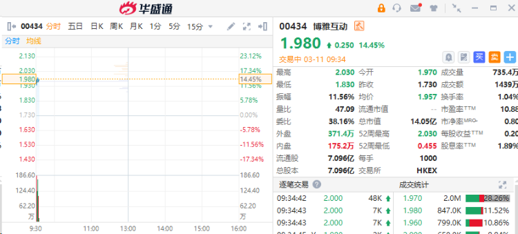 博雅互动 $00434.HK 大幅高开超14%,截至发稿,涨14.45%,报1.98港元,成交额1439万港元。