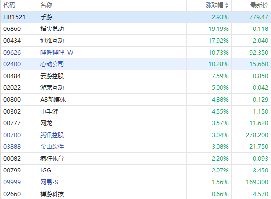 游戏股午后持续走高,截至发稿,指尖悦动涨超19%,博雅互动涨超17%,哔哩哔哩-W、心动公司涨超10%,中手游涨超4%,腾讯控股涨超3%。