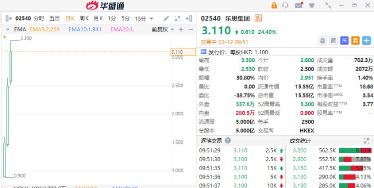 乐思集团(02540)上市以来持续走高,3个交易日累计大涨超180%,截至发稿,涨24.4%,报3.11港元,成交额2072万港元。