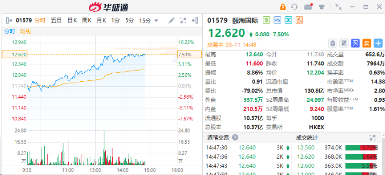 颐海国际 $01579.HK 再涨超7%,截至发稿,涨7.50%,报12.62港元,成交额7964万港元。