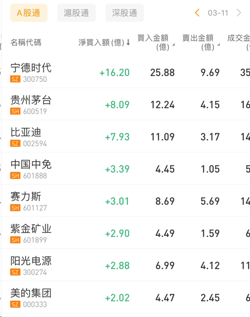 北向资金今日大幅净买入102亿元。宁德时代、贵州茅台、比亚迪分别获净买入16.2亿元、8.09亿元、7.93亿元。招商银行净卖出额居首,金额为2.72亿元。