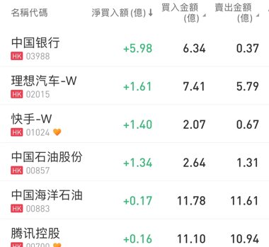 其中,南向资金净买入中国银行5.98亿港元,分别加仓理想汽车-W、快手-W1.61亿港元、1.4亿港元;净卖出南方恒生科技2.34亿港元,沽出建设银行2.12亿港元。