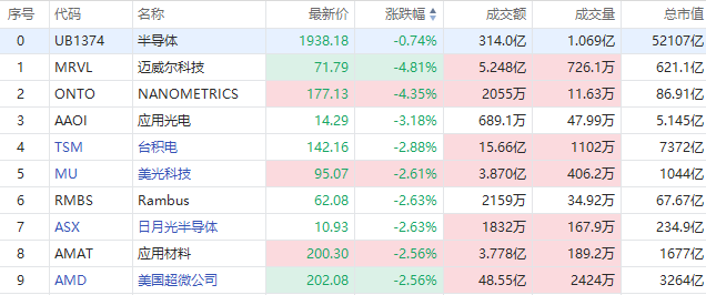 美股半导体概念股多数走低,截至发稿,迈威尔科技跌超4%,台积电、美光科技、日月光半导体、美国超微公司跌超2%。
