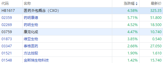 华盛资讯3月12日消息,CXO板块早盘集体上扬,药明康德涨超5%,领涨概念股,药明生物、康龙化成涨超4%,维亚生物涨超3%,泰格医药涨超2%。