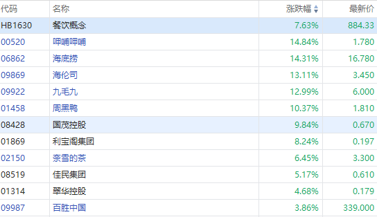 港股餐饮板块今天全面造好,尤其是蓝筹海底捞(06862.HK)三连升兼突破百天线(15港元),午后高见17.46港元,现报16.78港元,急涨14%。