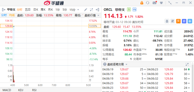 甲骨文绩后涨超13%,该公司在截至2月29日的第三财季中,季度营收132.8亿美元,较上年同期的124亿美元增长了7%;净利润同比增长27%至24亿美元,合每股85美分;调整后的每股收益为1.41美元,高于分析师预期的1.38美元。