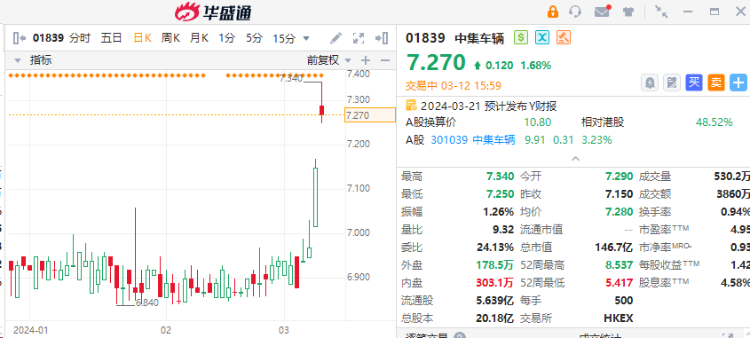 受此消息影响,中集车辆AH股今日出现异动,截至发稿,分别涨3.54%及1.54%,均创下阶段新高。
