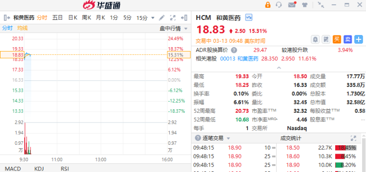 华盛资讯3月13日消息,美股早盘,热门中概股集体走强,中概创新药股大涨,截至发稿,和黄医药涨超15%,百济神州涨超12%,再鼎医药涨超11%。