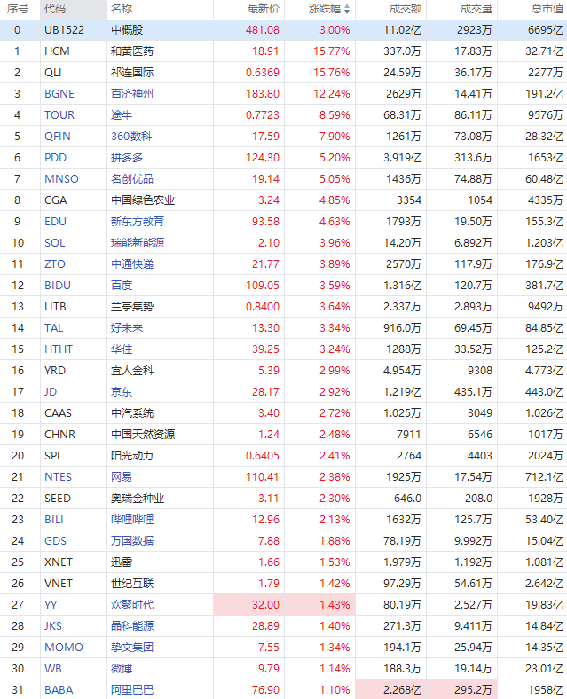 其他中概股方面,途牛绩后涨超8%,拼多多、名创优品涨超5%,新东方教育涨超4%,百度、好未来涨超3%,京东、网易、哔哩哔哩涨超2%,阿里巴巴涨超1%。ETF方面,2倍做多沪深中国互联网指数ETF-Direxion $CWEB 涨4%,3倍做多富时中国50指数-Direxion $YINN 涨超3%。